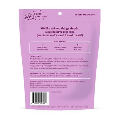 Ingredients: Oat Flour, Duck, Rolled Oats, Coconut Glycerin, Molasses, Flaxseed, Vegetable Oil, Cranberries, Beets, Citric Acid