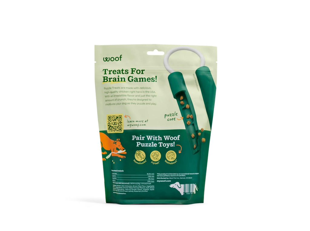 These Woof treats are perfectly sized to pair with puzzle toys, and they make great training treats for good boys and girls. Puzzle Treats turn everyday fun into a tasty, brain-boosting challenge. Crafted with real chicken and brown rice, these protein-rich rewards are air-dried to lock in drool-worthy flavor (and irresistible aroma). Designed to fit Nomchucks, Walkabout, Flyball, and other puzzle or treat dispensing toys. 5 oz.
